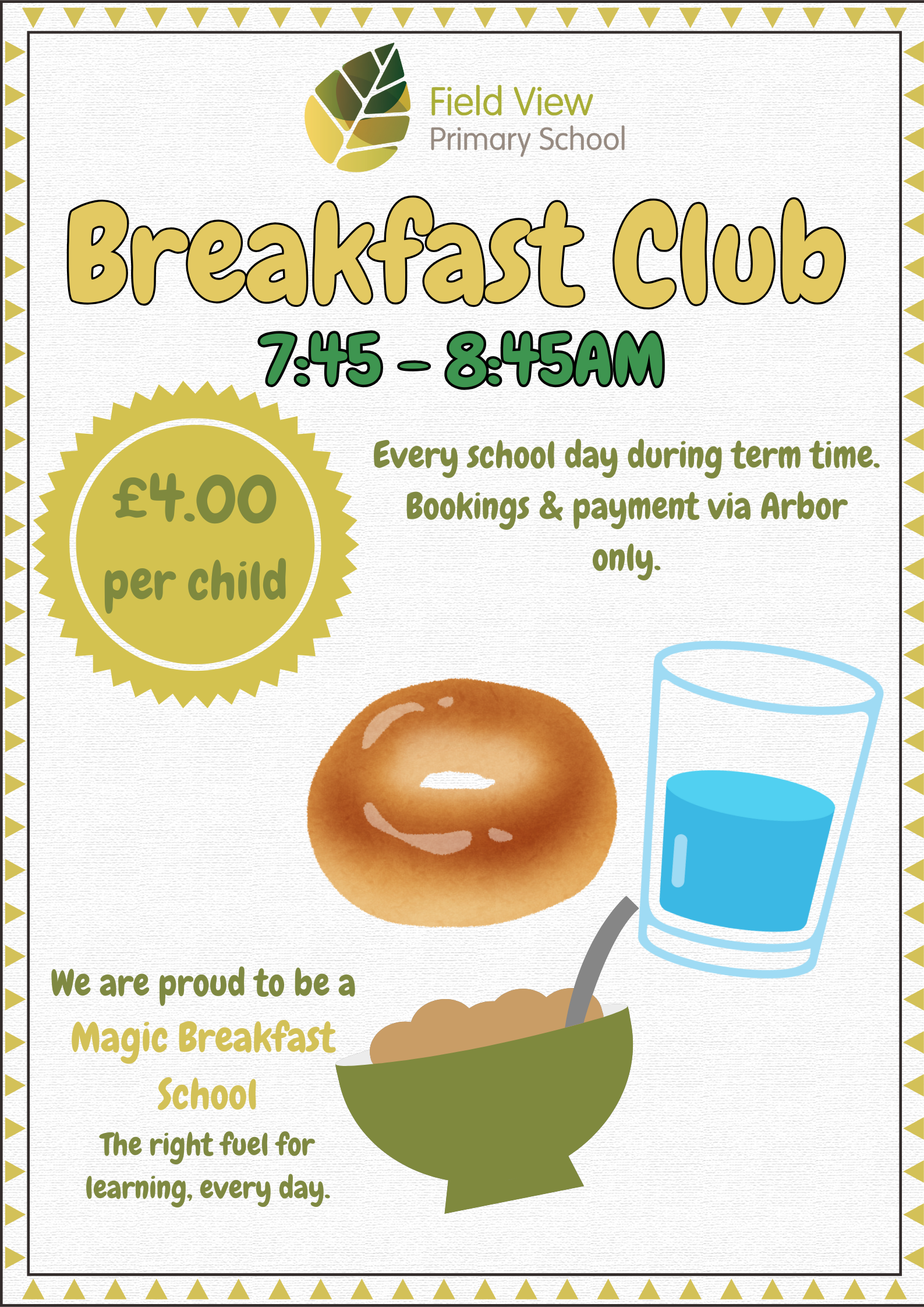 Breakfast begins at 7:45am and will finish at 8:45am. Breakfast will cost £4.00 per child per day. Parents will be required to book via Arbor only and can choose which days to book online.